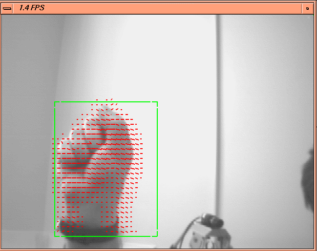 Shown here is live video (1.4 FPS) overlaid with a red flow field, surrounded by a green tracking window. The magnitude of the flow vectors is rendered at left, brighter pixels indicate faster motion, black indicates no motion. The green blob indicates the result of figure / ground separation.